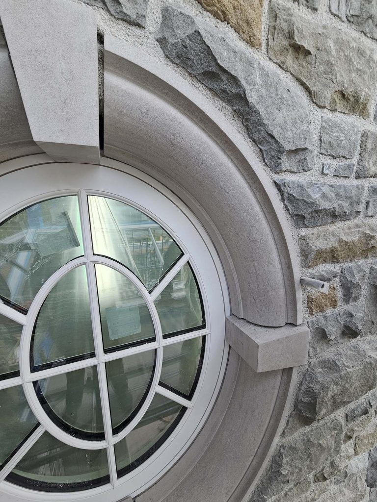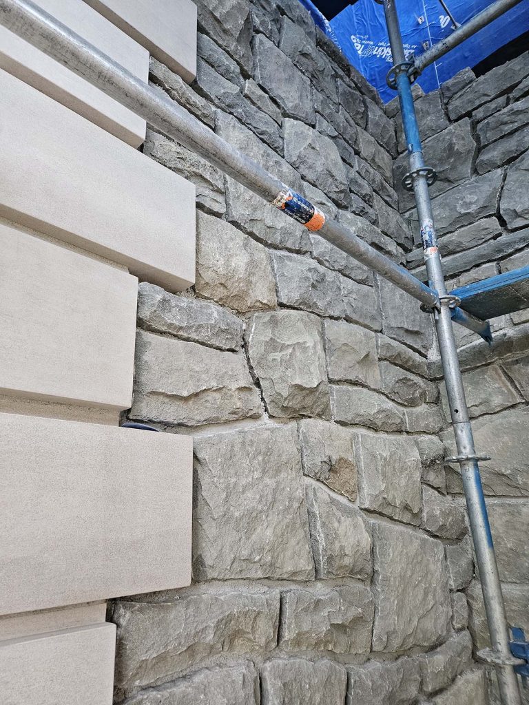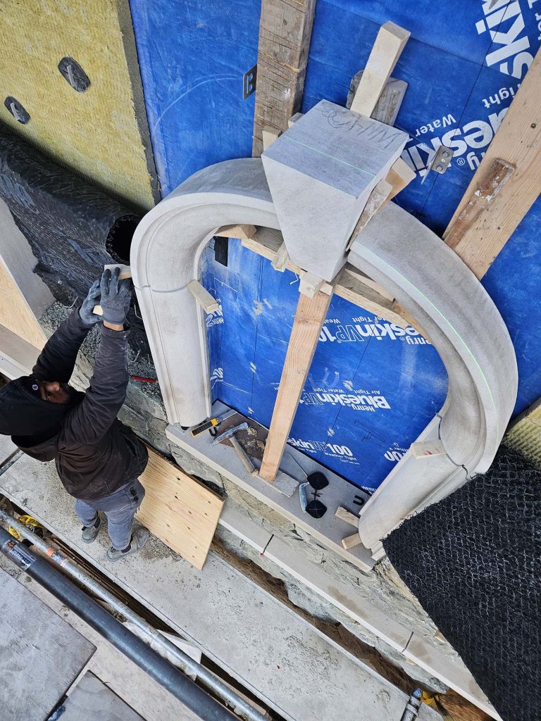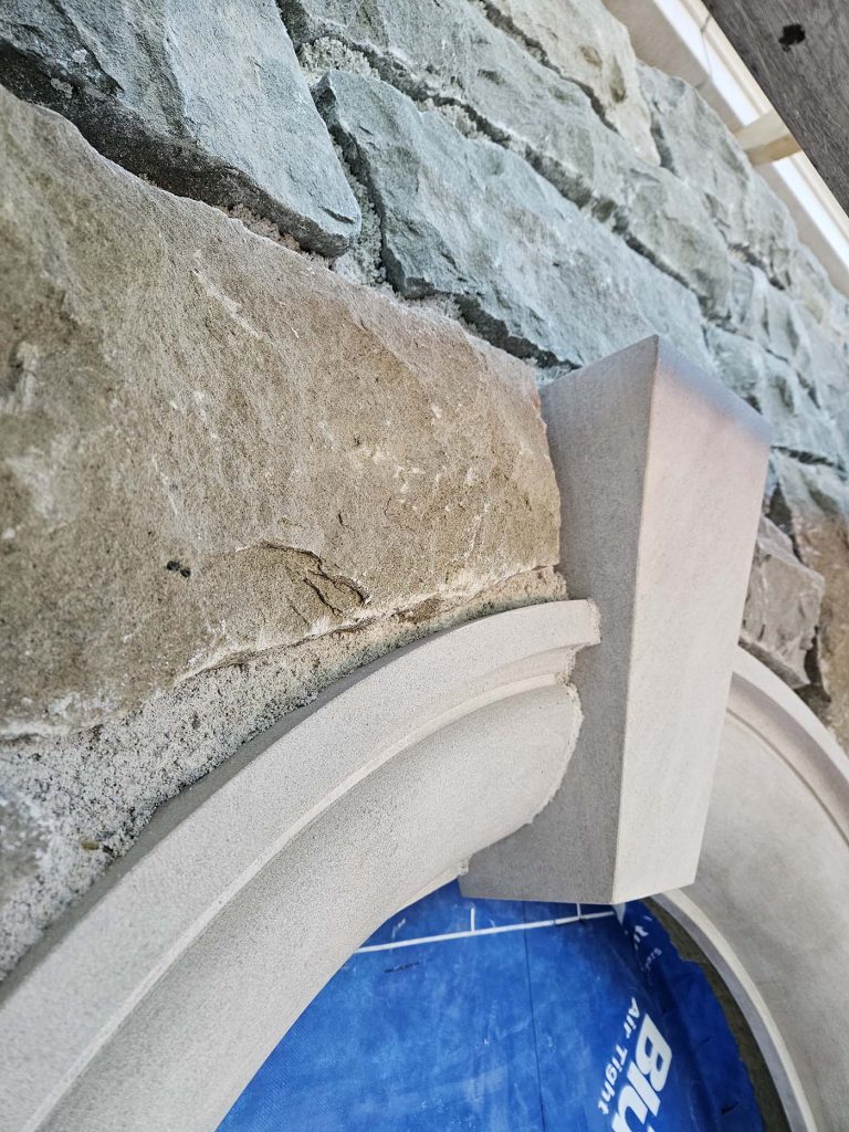 • Heavy stone elements installed and set with precision, including craned corner stones and detailed architectural features