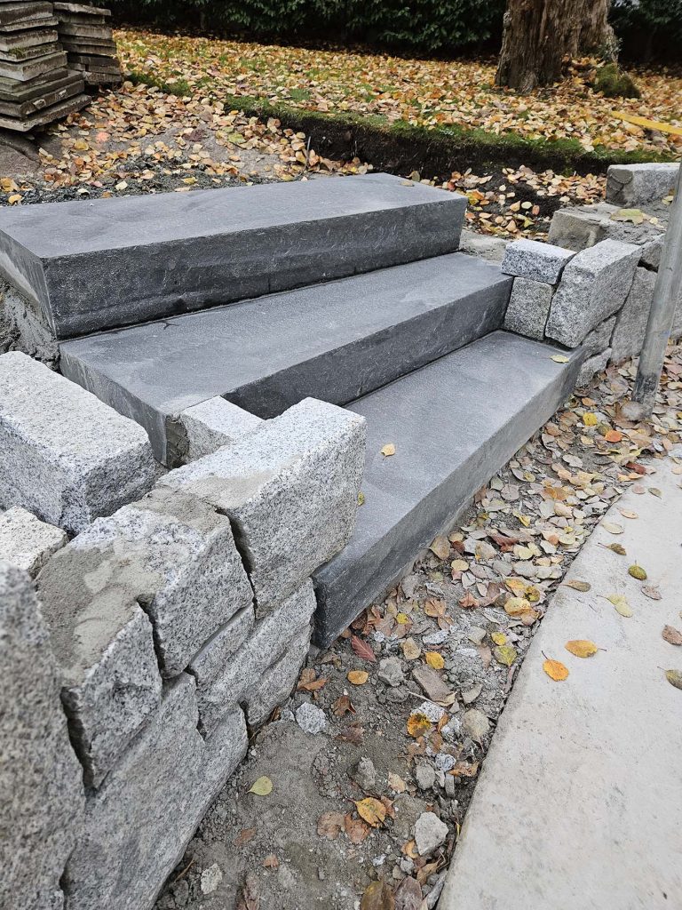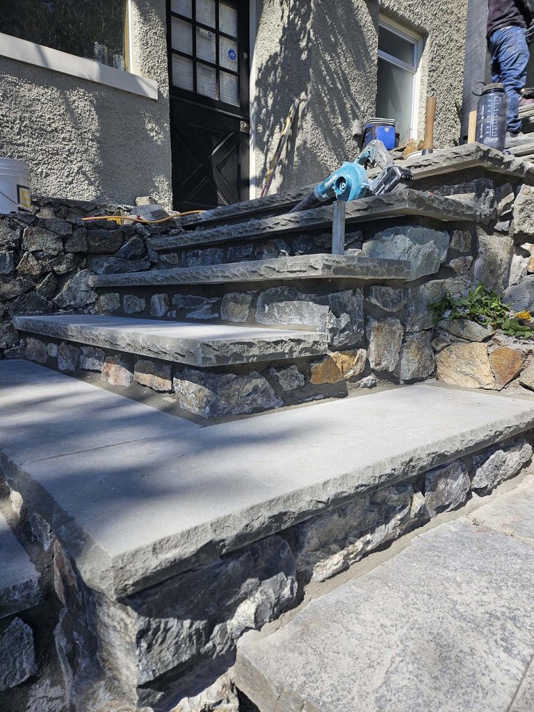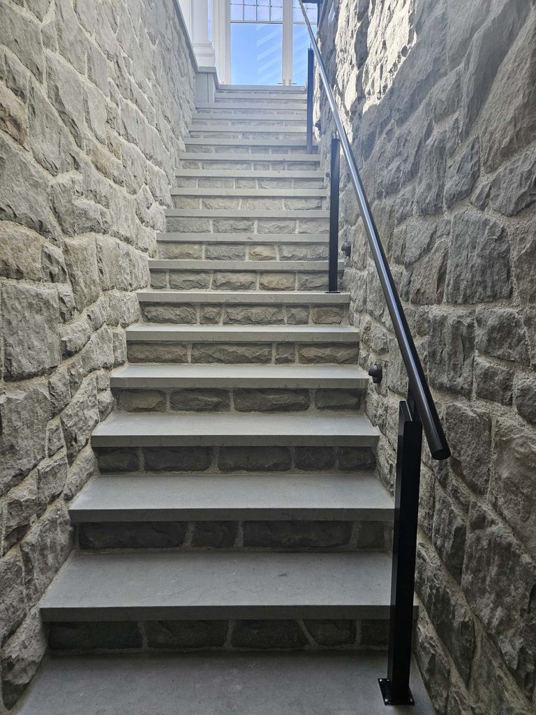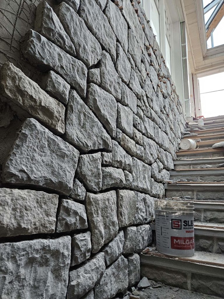 • Heavy stone elements installed and set with precision, including craned corner stones and detailed architectural features