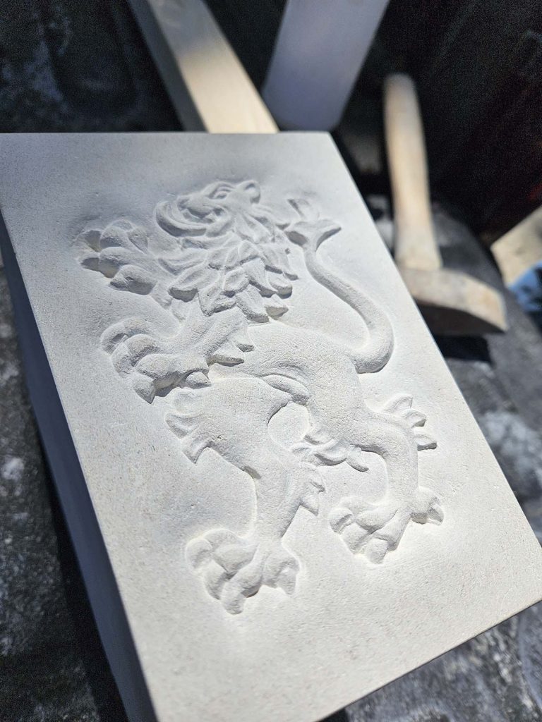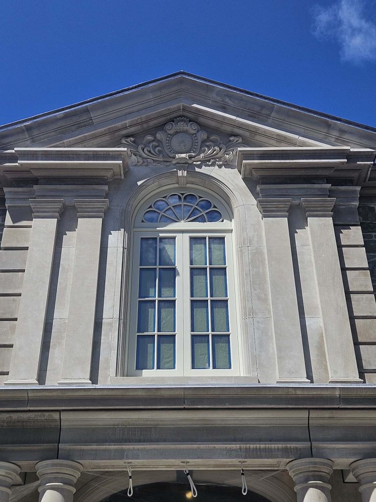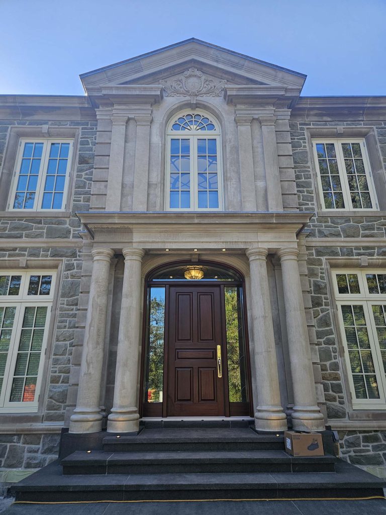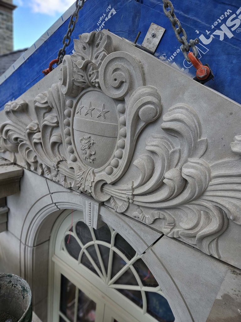 The project included a hand-carved tympanum family crest and additional carved elements, demanding meticulous planning and execution to ensure alignment, proportion, and long-term durability.