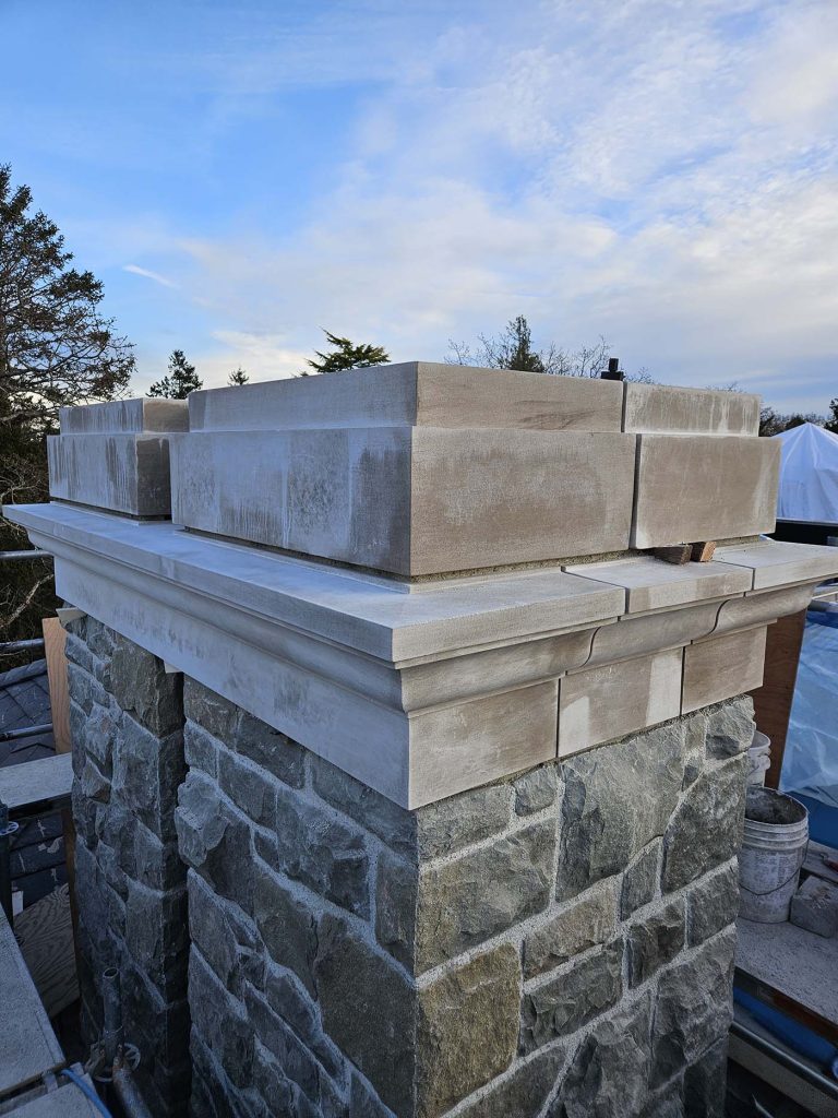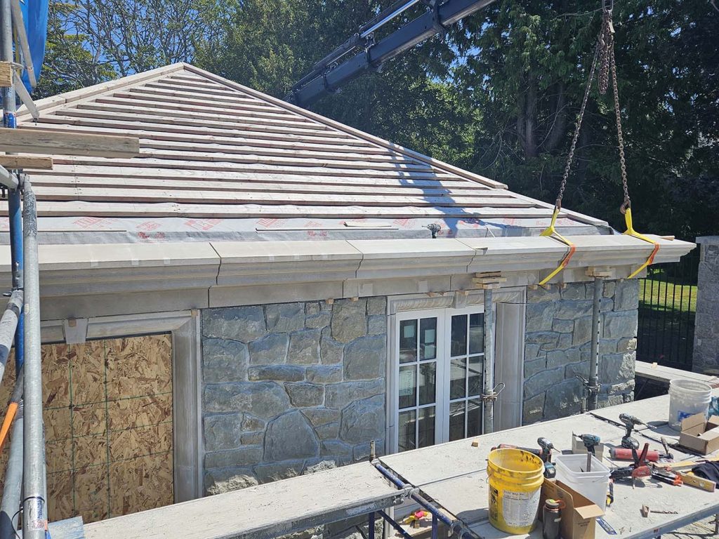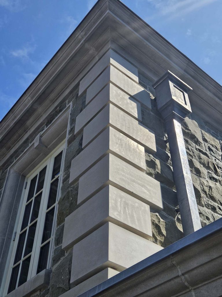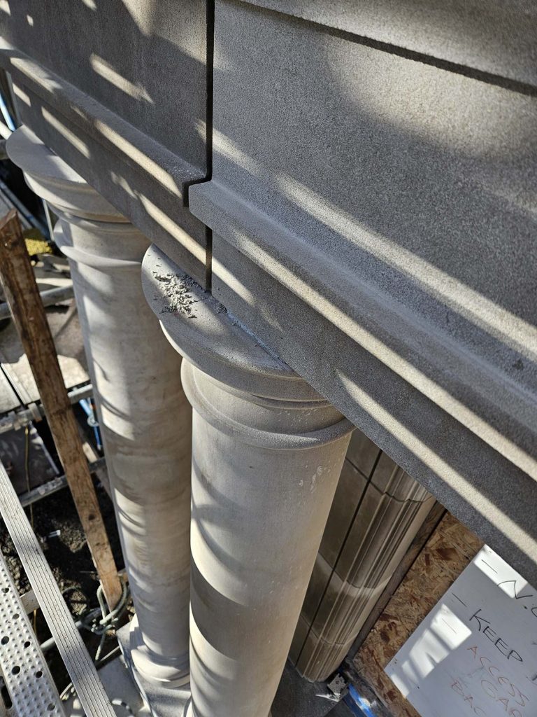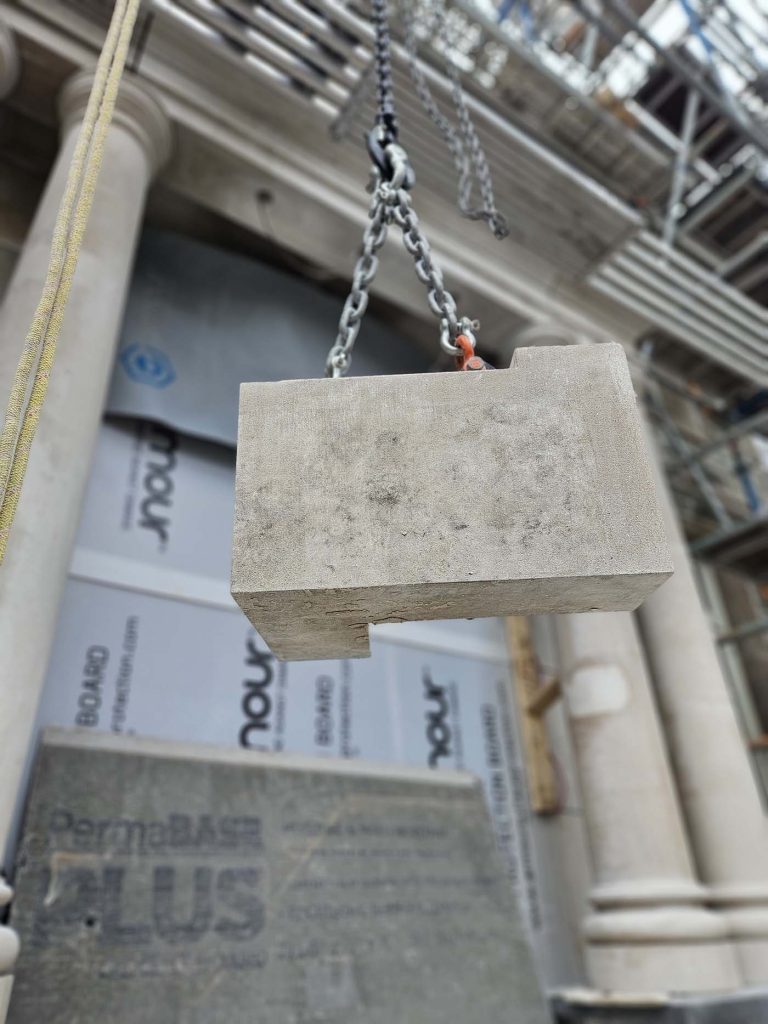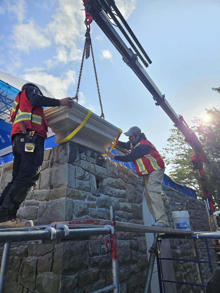 The scale of masonry and level of detail were significant. Components included 12-foot-long corner stones craned into place, each weighing thousands of pounds and requiring careful staging, safe lifts, and precise setting.