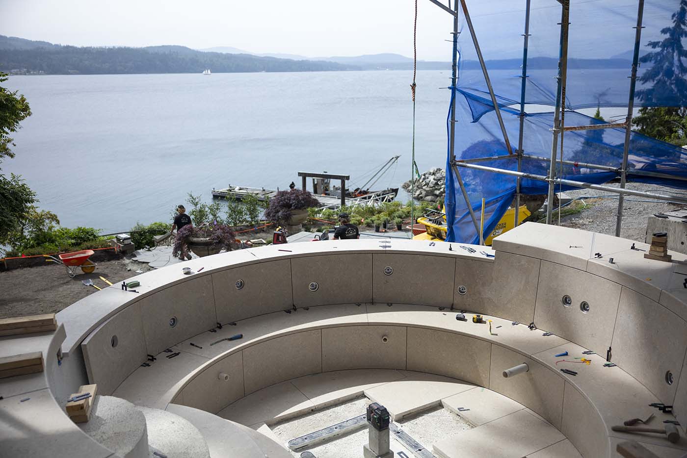 The masonry work is executed with a focus on sequencing, structural reliability, and refined detailing, balancing high design expectations with the practical demands of water-feature construction and heavy material handling.